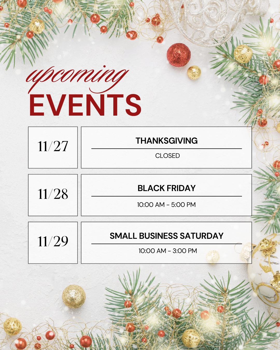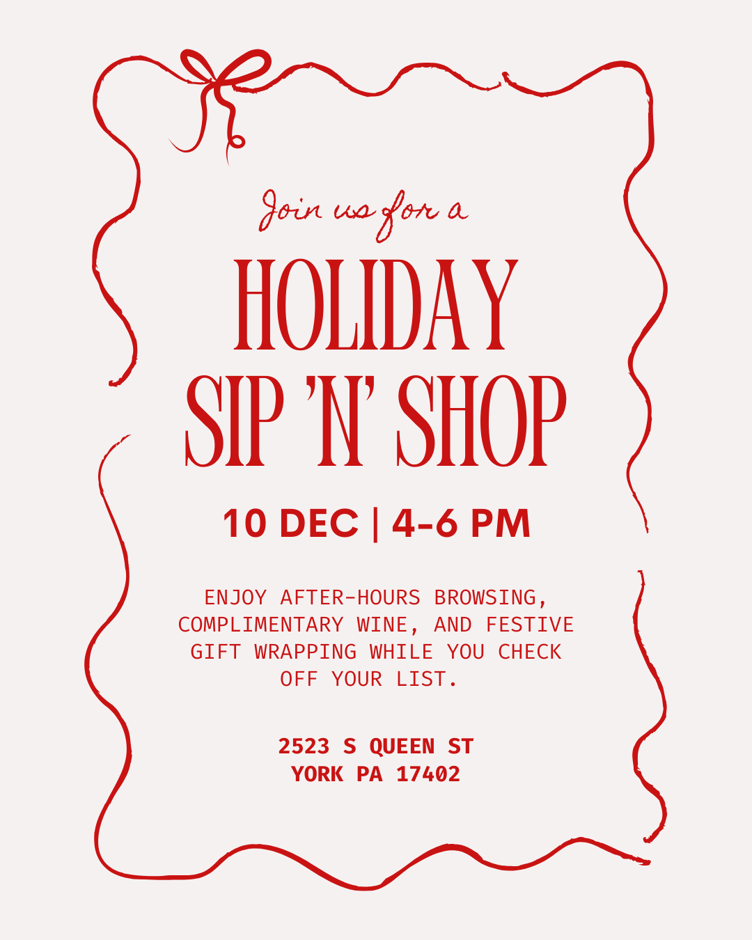Join us for a Holiday Sip & Shop! Enjoy after-hours browsing, complimentary wine, and festive gift wrapping while you check off your list. It’s an easy, feel-good way to get into the holiday spirit—and find something special for everyone.