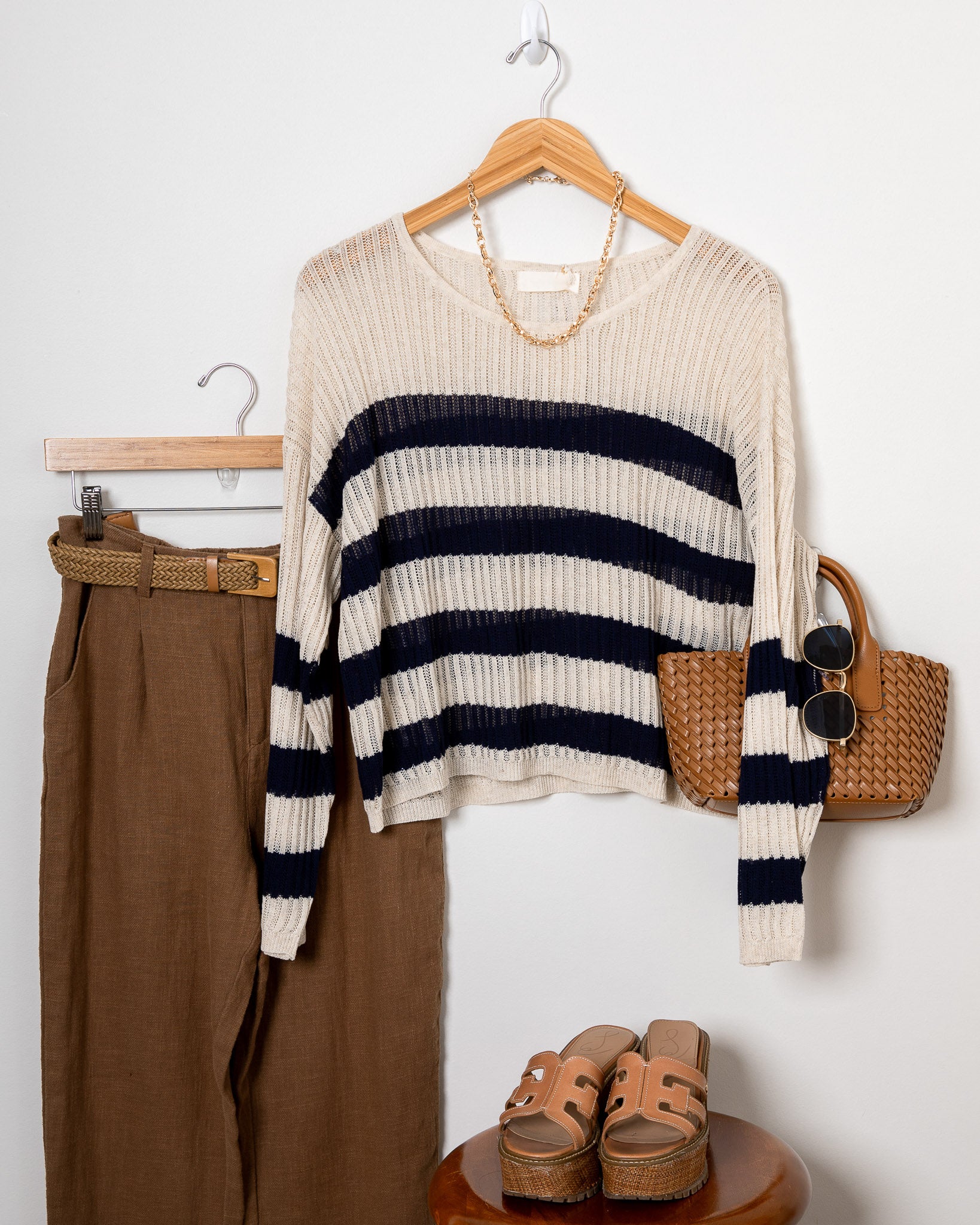 From light ocean spray to the breeze in a boat's sails, the Come Sail Away Pullover blends nautical charm with a lightweight, crochet-style knit for a truly coastal-inspired look. Whether you're using it to throw on over your swimsuit or pair with your favorite shorts, the loose and effortless silhouette pairs perfectly with our rich, golden-hued linen pants. Add a gold chain necklace to catch the gleam of the sun and a woven bag.
