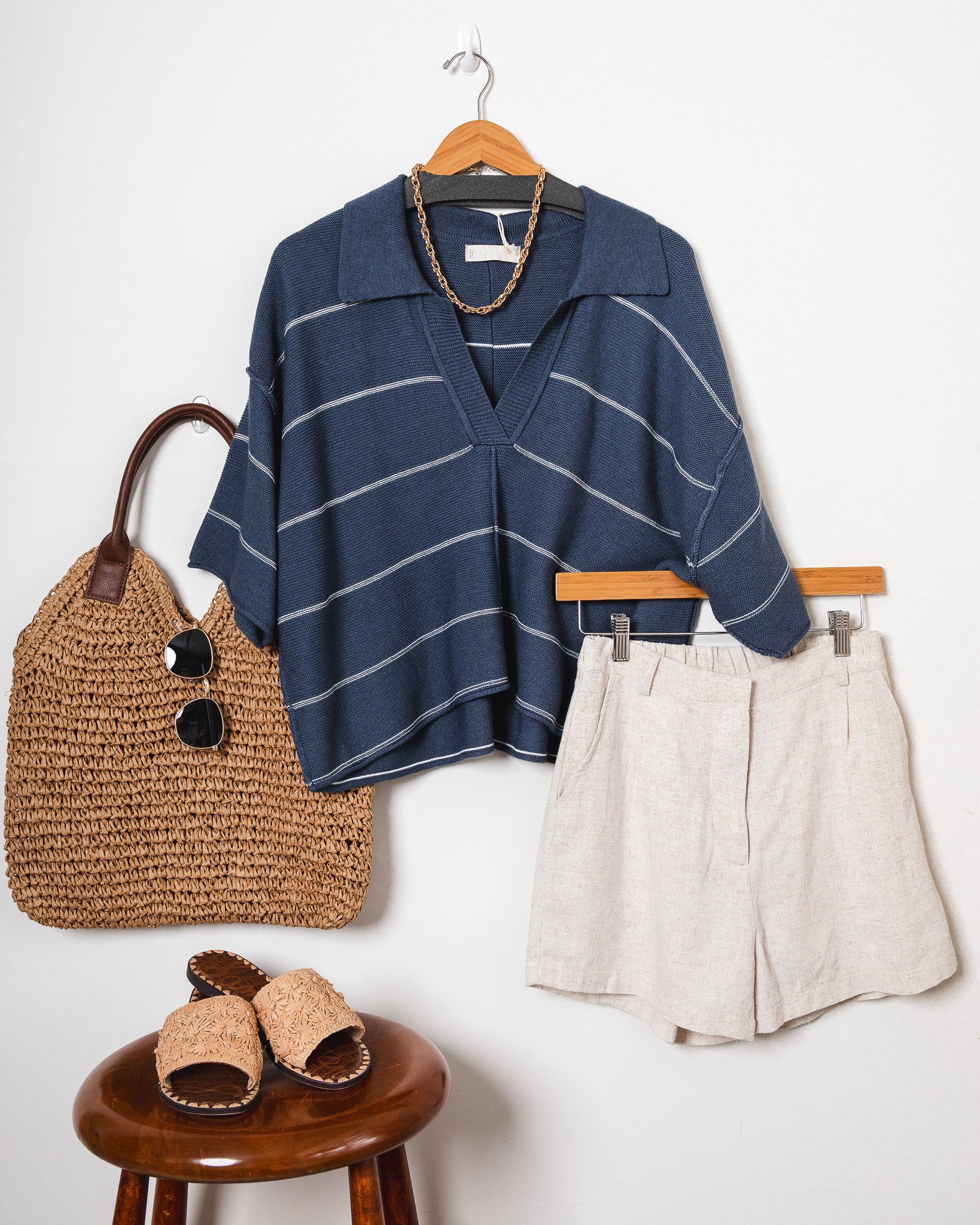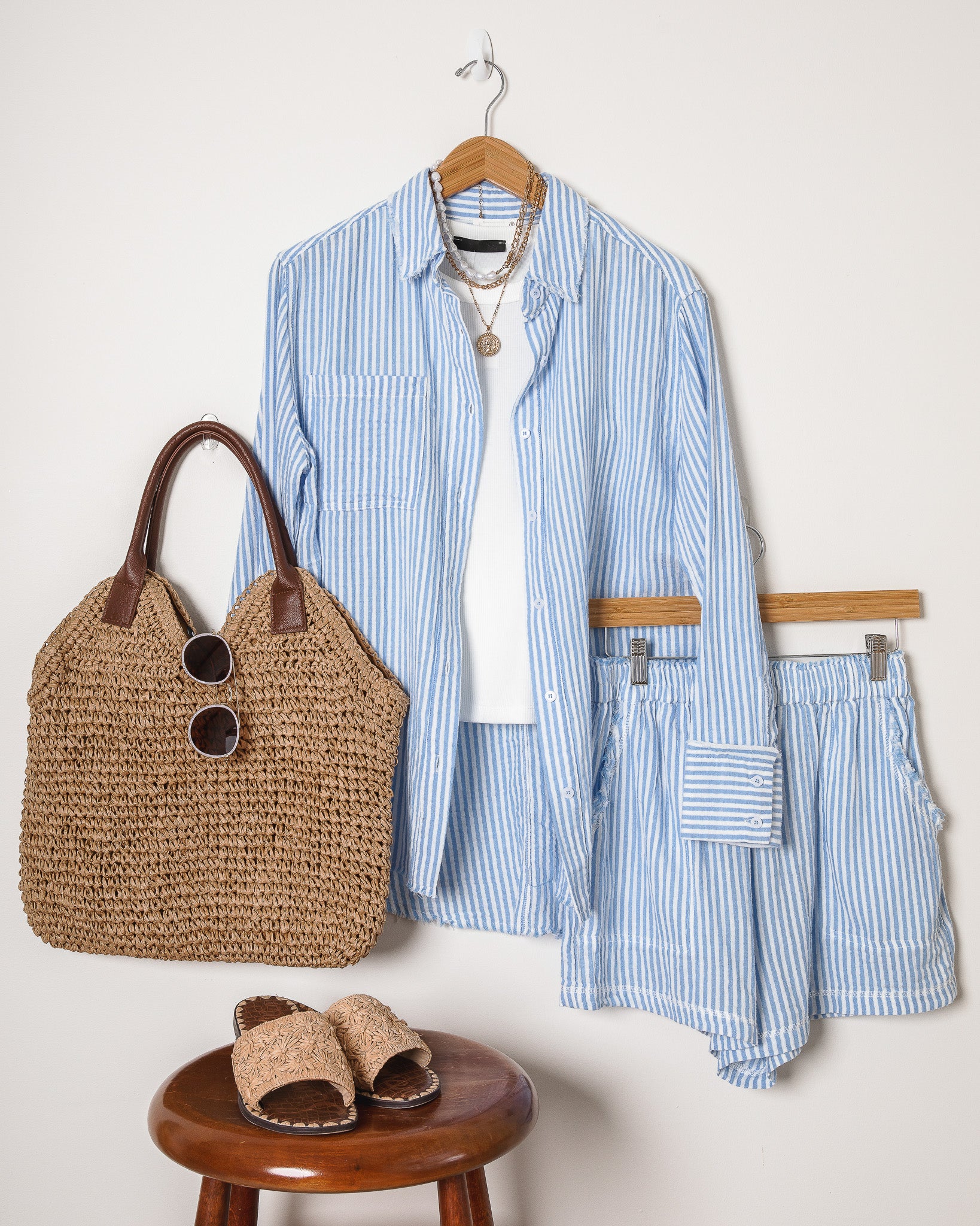 Experience the essence of stylish, laid-back luxury with the Brunch & Beach Top and matching breezy shorts. Wear the set open of your favorite swimsuit or a simple white tank. Complete the look with neutral sandals and a woven bag for a touch of beachside charm.