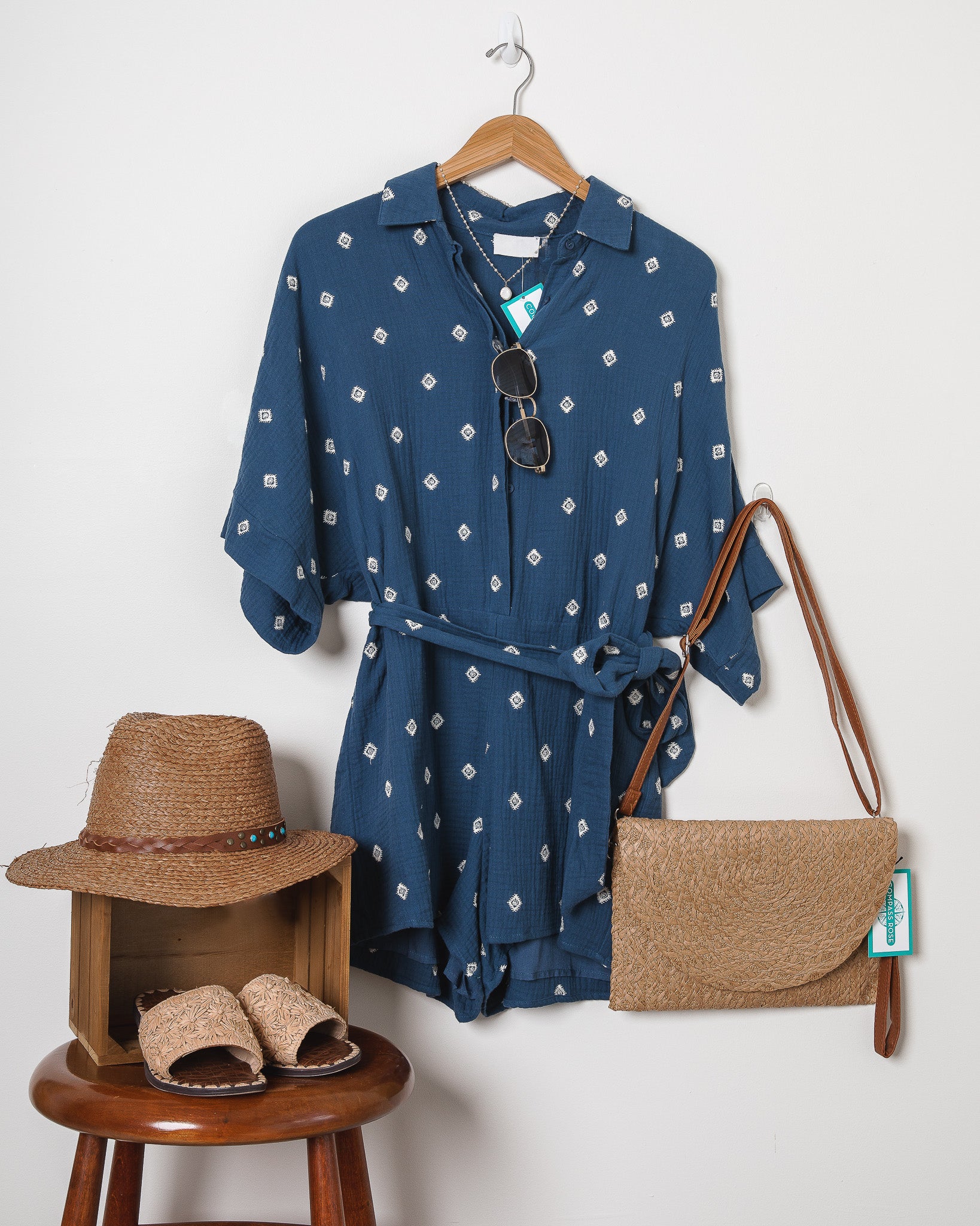 Immerse yourself in the playful allure of islands with the Summer Muse Romper in a breathtaking classic blue hue. Feel the island breeze dance along your skin as you wander sun-kissed shoes to the rhythm of steel drums. In a whimsical romper design, the crisp white embroidery adds a touch of bohemian charm, while the included belt accentuates your figure effortlessly. Exude an air of carefree elegance by adding a pearl-inspired necklace and woven accessories.
