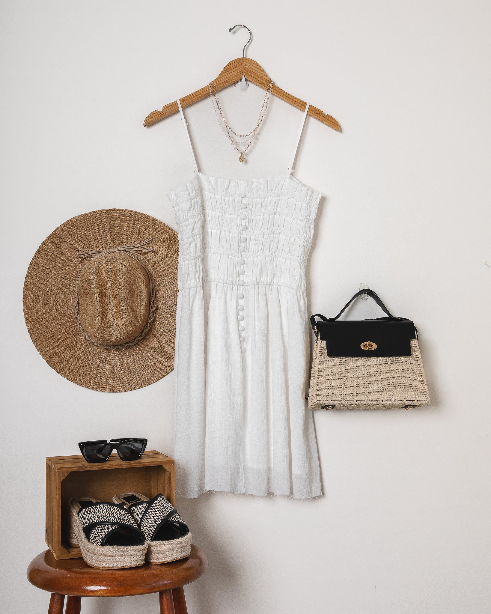 Just imagine... you're strolling along a sun-drenched coastline, feeling the soft sea breeze against your skin. The Short & Sweet Dress is your ultimate companion. With its lightweight cotton fabric, raw-edged hem, and delicately smocked top, this dress is a symbol of coastal chic fashion. Layer with gold jewels and a woven tote to make you feel like a true beachside goddess.