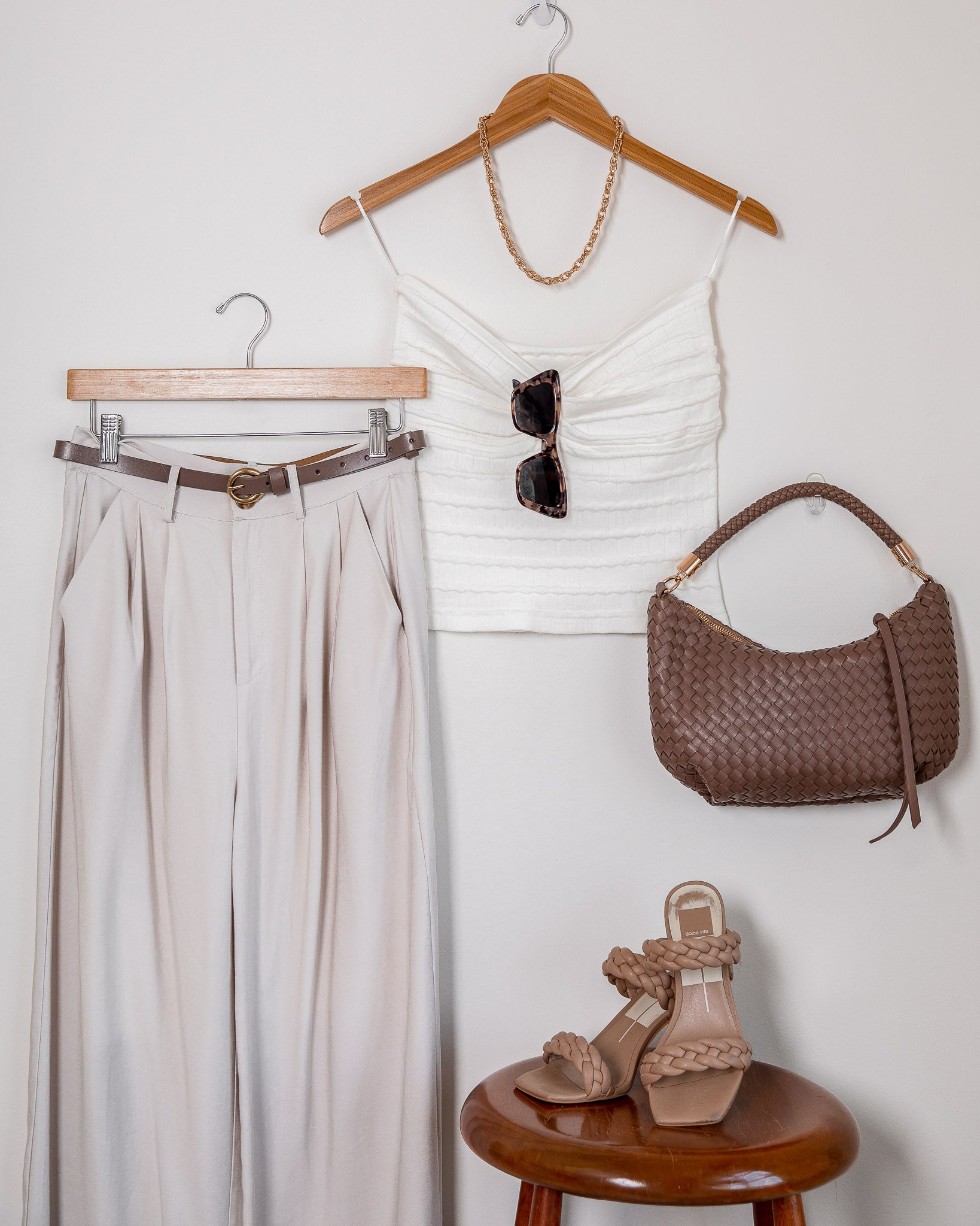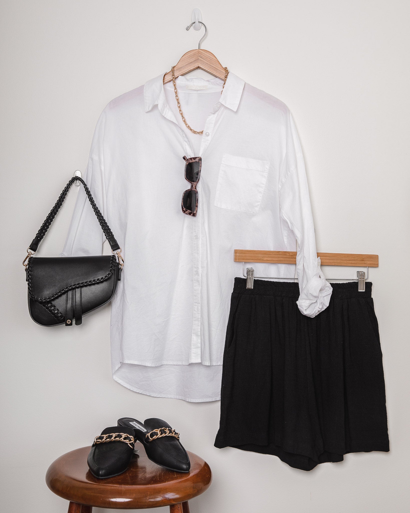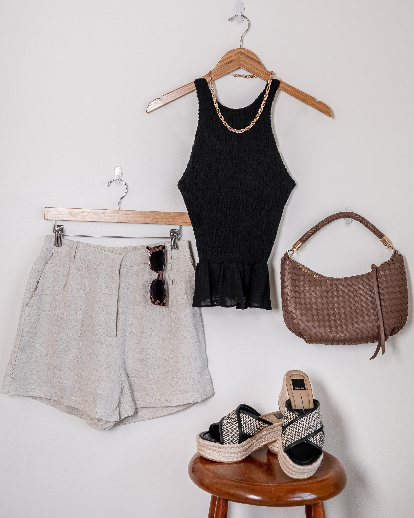 I styled it with a simple black linen tank for a more dressed-down vibe, trendy sunnies, gold jewelry, and a woven purse.