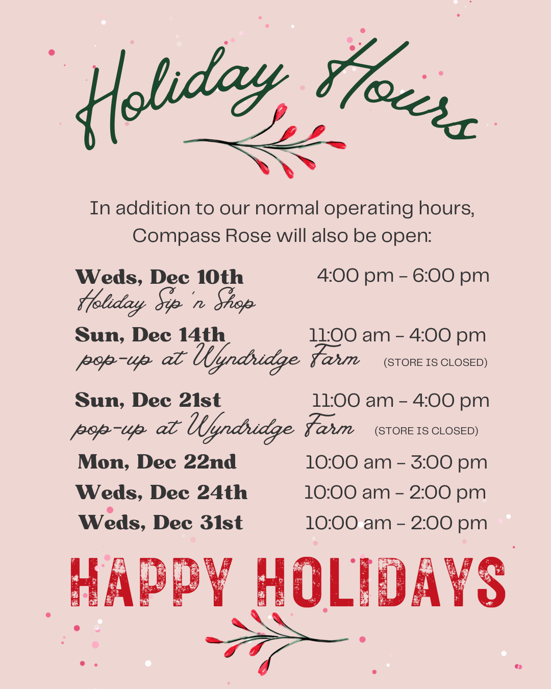 Compass Rose BTQ will be open Monday, 12/22 from 10am-3pm for additional shopping hours.