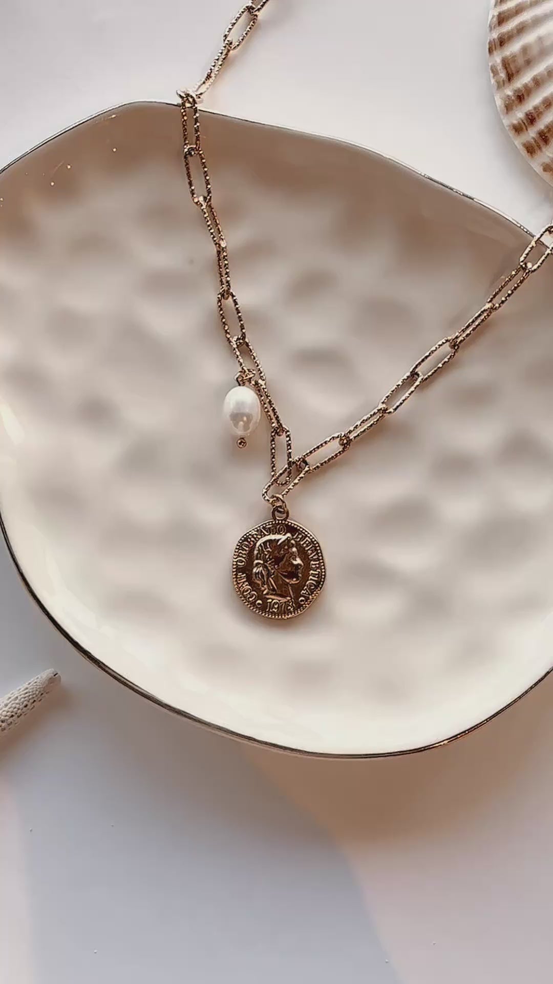 Meet the Althea Necklace. Perfect for any season, stunning gold necklace features a paperclip link chain and a gold coin charm and pearl charm.
