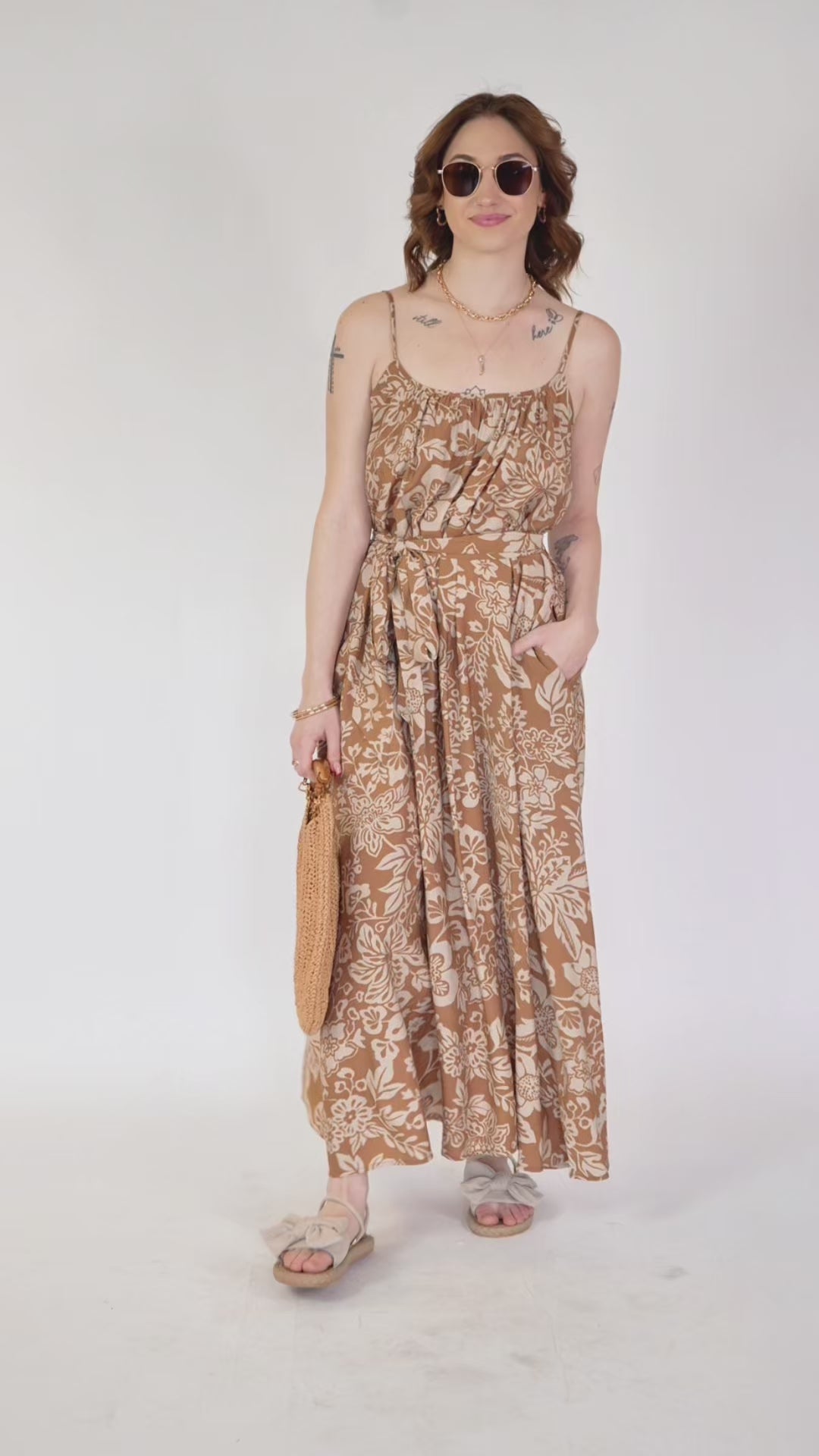 An effortlessly printed maxi dress featured in an A-line silhouette with stunning flowing skirt. This dress features adjustable straps and waist tie for a customizable fit.