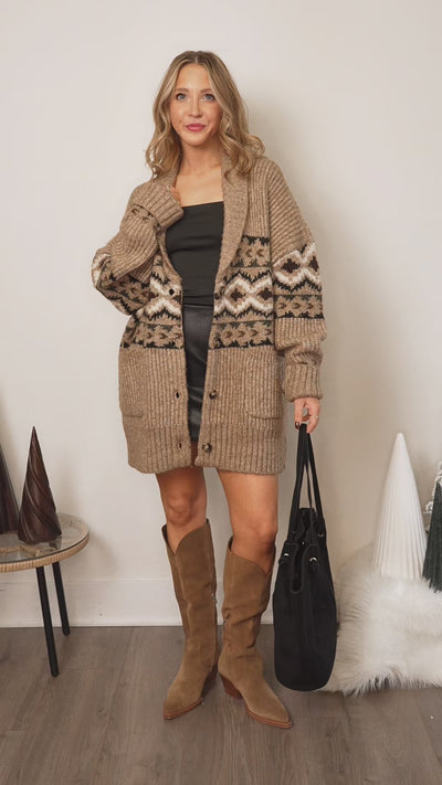 This cozy shawl-collar cardigan features a classic Fair Isle pattern, giving it a timeless cold-weather look. Constructed of chunky and soft knit, it includes front pockets and button closures for easy, everyday wear.