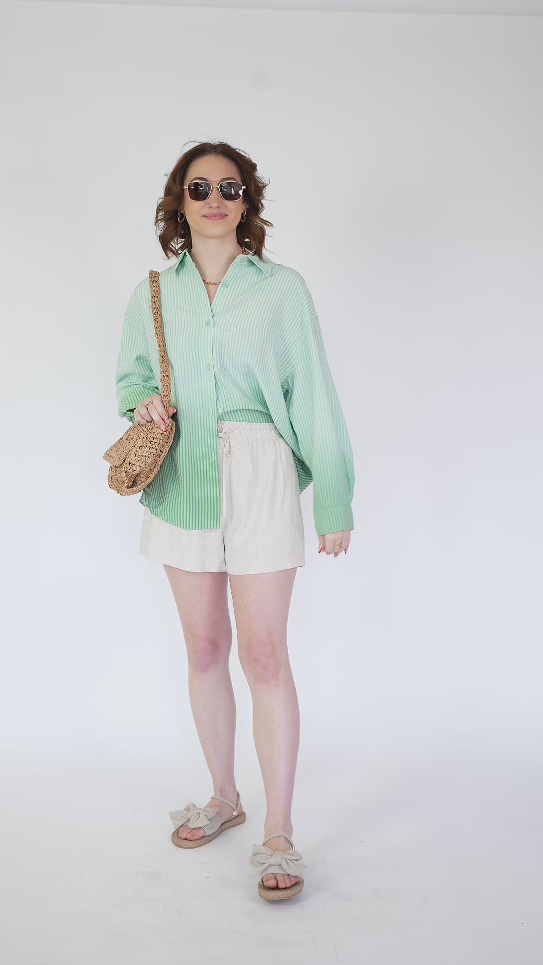 This button-front top is featured in a minty green ombre hue with stripes and an oversized silhouette with rounded high-low hem. It is constructed of a lightweight fabric for an easy, breezy & effortless vibe.