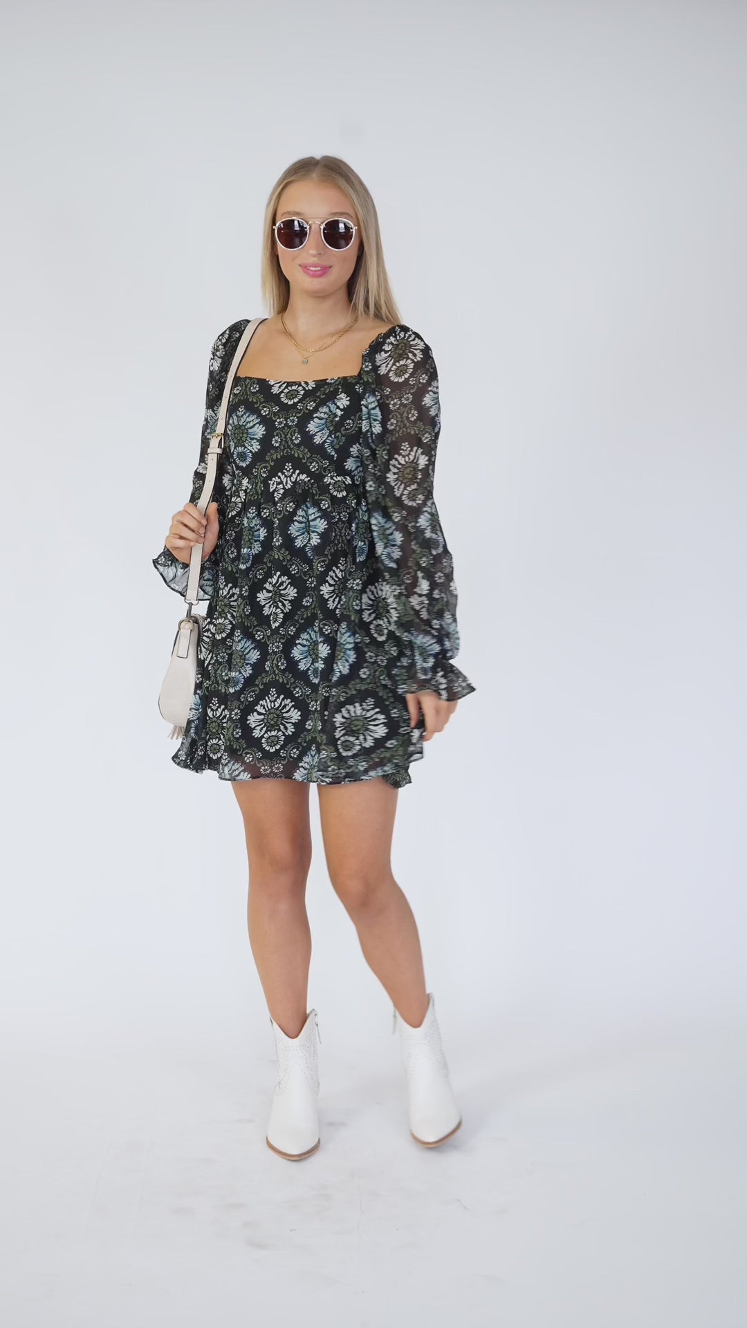This flattering printed dress features long sheer chiffon sleeves, a square neckline, and flowy babydoll silhouette. Complete with trumpet wrist detail and elastic back panel for comfort.
