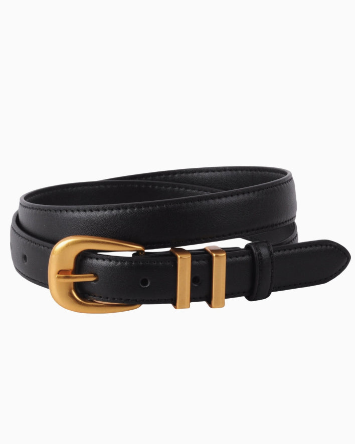 Elevate your accessory game with this stylish leather belt featuring a classic gold buckle and dual, sleek metal strap holders.