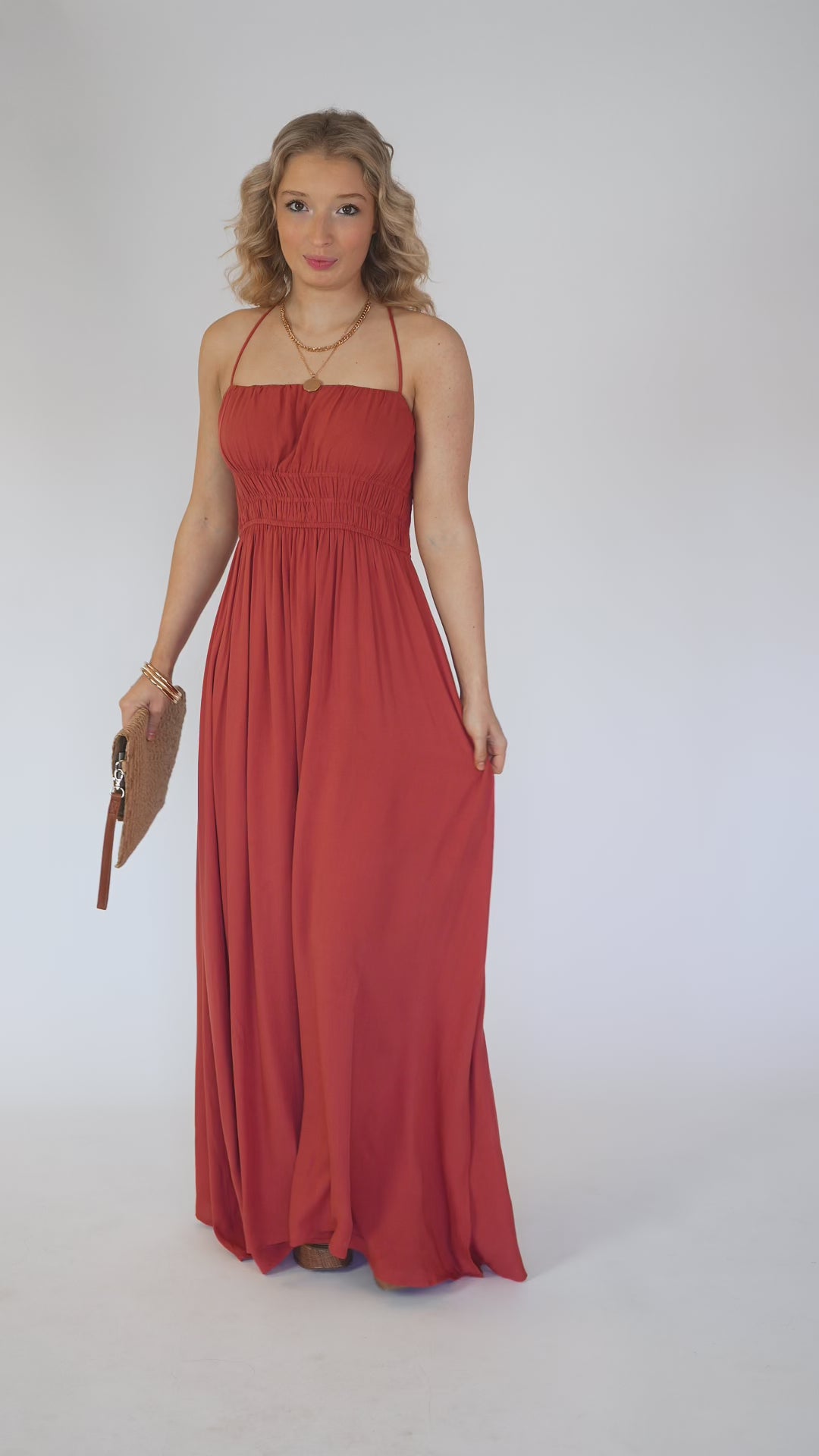 This maxi dress features a babydoll-inspired silhouette with the most stunning open back. Constructed of a an easy, breezy lightweight fabric, making it perfect for the summer heat.
