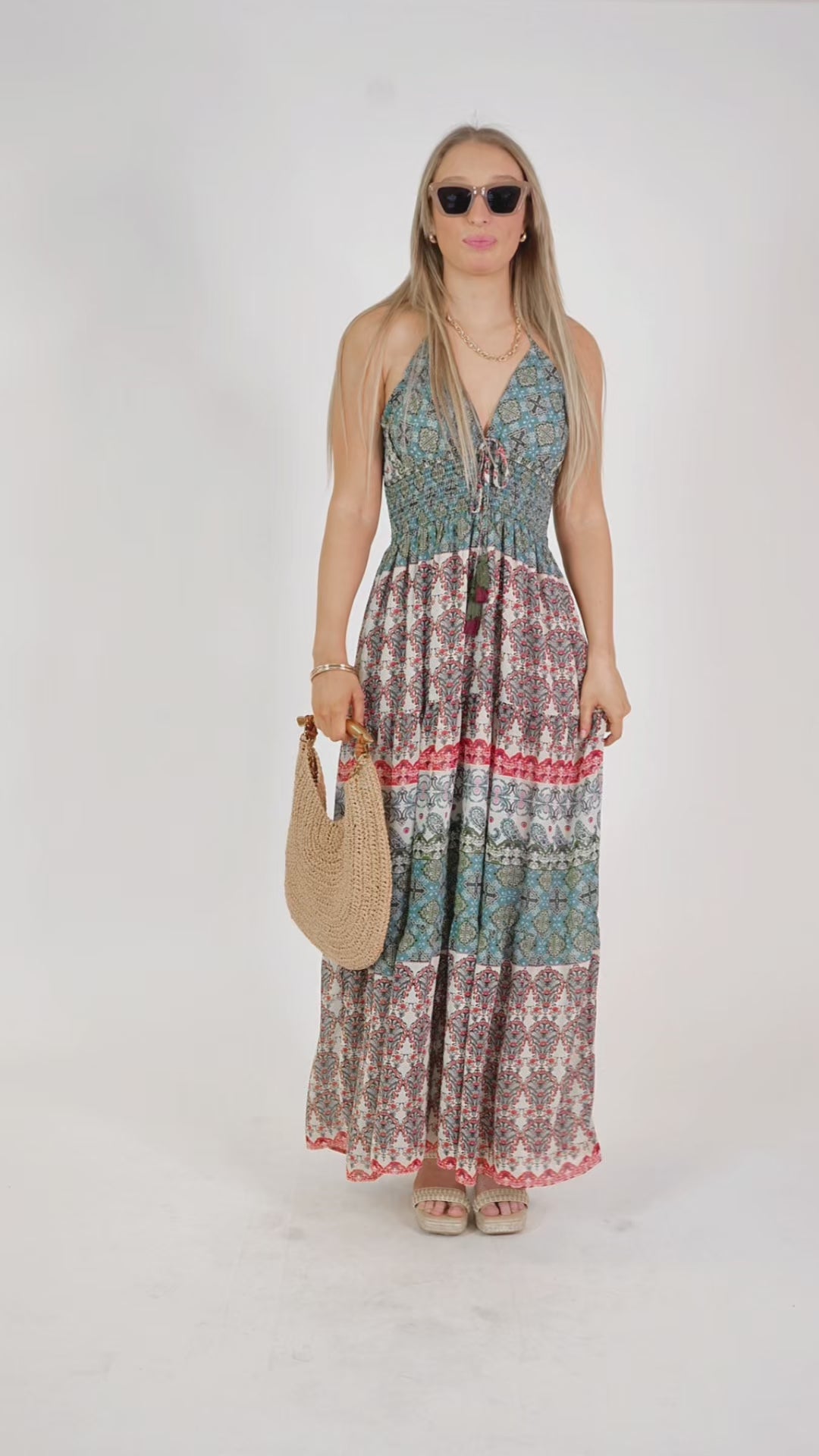 Effortlessly femme and bohemian, this maxi is featured in a lightweight chiffon fabrication and flattering halter-style with stunning print and decorative tassel details.