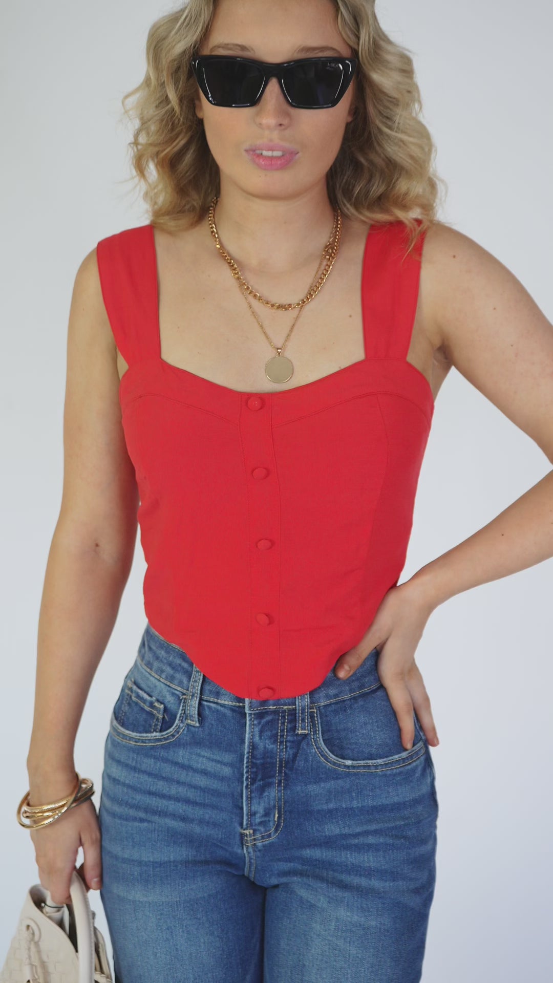 An effortless essential, this goes-with-anything tank is featured in a cropped fit with uniquely rounded hem. Details include a smocked elastic back panel for comfort and decorative buttons along the front.