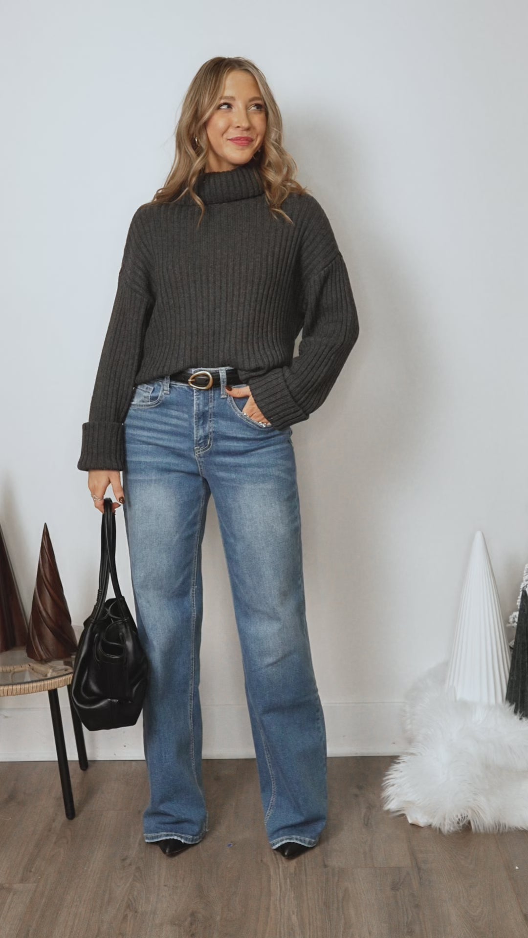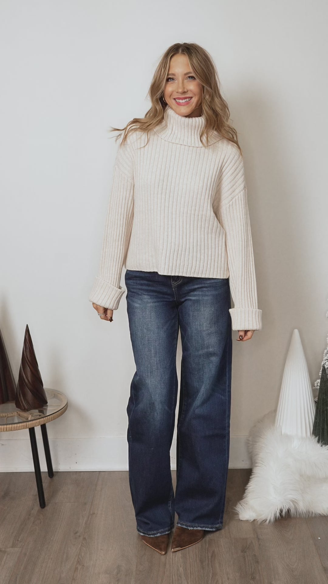 Your new favorite everyday layer featured in a chunky, ribbed-knit fabrication with a fold-over turtleneck and pre-cuffed sleeves for an extra cozy feel.